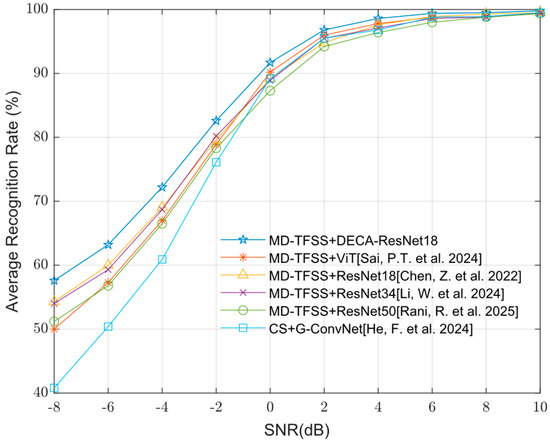 Figure 9 compares the average recognition performance of five modulation signals using AWGN channels across the SNR range from −8 dB to 10 dB, with all other parameters consistent with previous settings. The performance of the following models is evaluated: DECA-ResNet18, Vision Transformer (ViT) [21], ResNet18 [22], ResNet34 [23], ResNet50 [24], and the algorithm proposed in Reference [14].