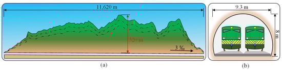 Diagram of the tunnel analyzed: (a) tunnel profile; (b) cross-section of the tunnel.