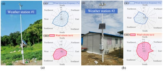 Wind direction and wind velocity measured at the entrance and exit of the tunnel: (a) tunnel entrance monitoring—(i) photograph of the monitoring site, (ii) wind direction plot, (iii) wind velocity plot; (b) tunnel exit monitoring—(i) photograph of the monitoring site, (ii) wind direction plot, (iii) wind velocity plot.