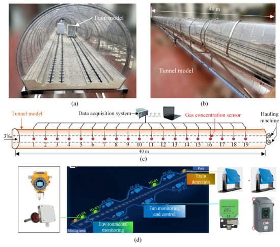 Tunnel model design: (a) cross-section view; (b) side view; (c) layout of the gas concentration sensors; (d) inspection system.