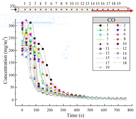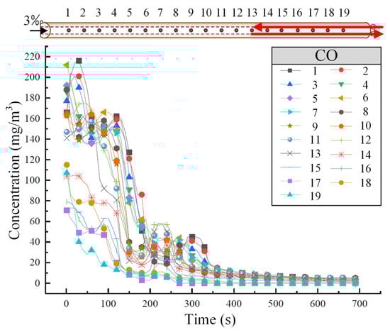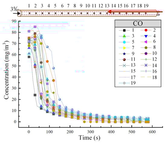 Figure 4 shows the variation in CO concentration at different tunnel cross-sections when the train is descending at a speed of 55 km/h. As shown in Figure 4, CO disperses more quickly at higher concentrations, and the dispersion ability gradually decreases, with the CO concentration at each cross-section tending to stabilize around 300 s.