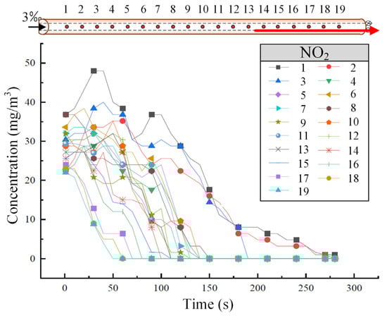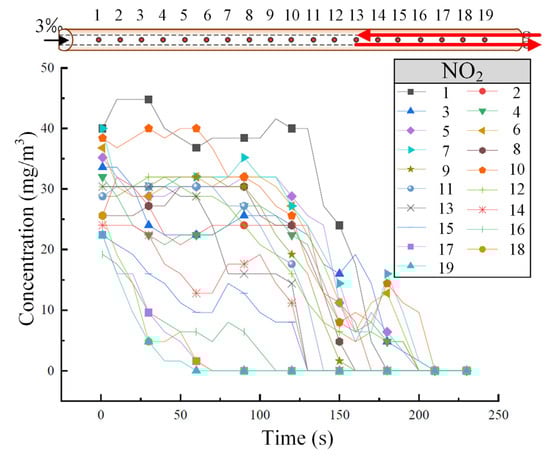 Figure 5 shows the variation of NO2 concentration at different tunnel cross-sections when the train is descending at a speed of 55 km/h. As shown in Figure 5, the concentration decrease pattern of NO2 at each sensor is similar to that of CO. NO2 primarily disperses toward the high tunnel entrance, but the diffusion rate is slower compared to CO. After approximately 150 s, the concentration of NO2 tends to stabilize and become uniform across the cross-sections.