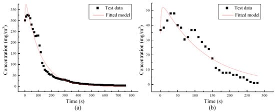 To verify the rationality of the diffusion data above, the relationship between CO and NO2 concentrations and time at different positions within the tunnel was fitted based on the instantaneous point source one-dimensional diffusion fundamental solution (Equation (1)), and the R2 values during each fitting process were also calculated. The average fitting results of the gas concentration around the NO2 sensor are shown in Figure 6. Including the fitting results presented in Figure 6, for CO, all the R2 values of the concentration fitting results are greater than 0.91, while for NO2, all the R2 values are greater than 0.80. These fitting results indicate that the diffusion of CO and NO2 concentrations in the scaled tunnel model generally follows the one-dimensional diffusion theory for an instantaneous point source, thereby confirming the validity of the scale tunnel model. Therefore, the scaled model constructed in this chapter can be further used to explore the distribution and diffusion patterns of harmful gas under different operating conditions.