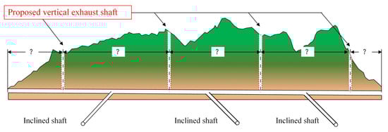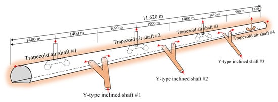 As previously mentioned, the construction of the tunnel adopted a sectionalized excavation approach for long tunnels using three inclined shafts. Based on the model test results from the previous chapter, it was found that due to the tunnel’s length, harmful gas tends to exhibit a multi-peak distribution along the longitudinal axis of the tunnel. To efficiently achieve rapid ventilation and air exchange within the tunnel, it is necessary to set a vertical shaft between the tunnel entrance and inclined shafts [], as well as between the two inclined shafts, to assist with ventilation. Inclined shafts are typically established for air inlets, while vertical shafts serve as exhaust outlets, reducing the overall system resistance and maintaining wind pressure balance within the tunnel. Therefore, the basic ventilation scheme for the tunnel is outlined in Figure 10.