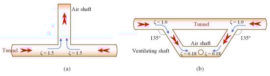 Limited by the terrain and geological conditions at the entrance of the inclined shaft, the angle of intersection between the inclined shaft and the main tunnel is not 90 degrees. As indicated in “Table A.0.1: Commonly Used Local Resistance Coefficients” in the Code for Design on Operating Ventilation of Railway Tunnel (TB 10068-2024) [], there is a significant variation in the local resistance for different air supply and exhaust directions in inclined shafts, as shown in Figure 11.