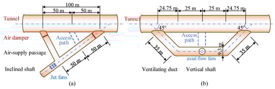 To reduce electrical energy consumption during railway operations, a Y-type ventilation duct is added at the intersection of the construction auxiliary tunnel and the main tunnel, as shown in Figure 13a. It is equipped with a combination of air dampers. The dampers are dynamically adjusted based on the direction of the train and the concentration of harmful gases, altering the direction of the fresh airflow. This design fully utilizes the piston effect of the train to introduce fresh air into the tunnel, thereby reducing the number of ventilation devices that need to be activated and the duration of their operation.