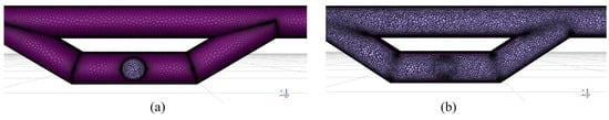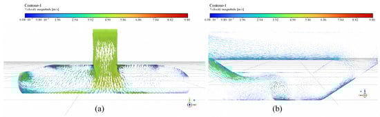 Resistance optimization for inclined shafts: (a) original design; (b) after optimization. (The red arrows represent the direction of the airflow.)