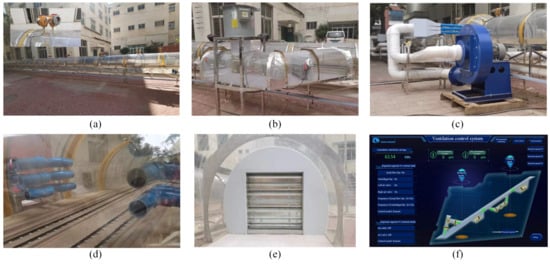 Improved experimental models for ventilation effect verification: (a) tunnel model; (b) T-type shaft; (c) jet fan; (d) mechanical ventilation process; (e) dampers; (f) intelligent monitoring and control system.