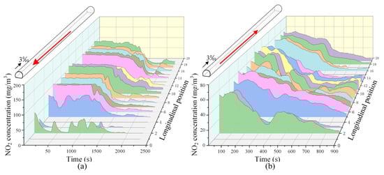 Spatial–temporal distribution of NO2 concentration in the tunnel (without mechanical ventilation, under the most unfavorable operating conditions in one direction): (a) upward operating conditions; (b) downward operating conditions. (The red arrow represents the running direction of the train.)