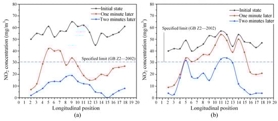 Comparison of the concentration distribution of NO2 at different typical moments (without mechanical ventilation, under the most unfavorable operating condition in one direction): (a) upward operating conditions; (b) downward operating conditions.
