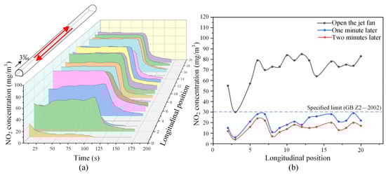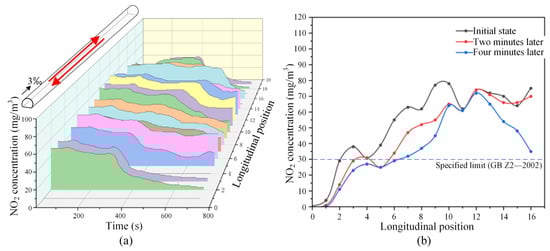 Variation of NO2 concentration in tunnels (with mechanical ventilation, under the most unfavorable operating condition in two directions): (a) spatial–temporal distribution of NO2 concentration; (b) comparison of NO2 concentration distribution at different typical moments. (The red arrow represents the running direction of the train.)