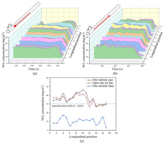 Figure 21 depicts the variation of NO2 concentrations across different sections of the tunnel under the most unfavorable operating condition for bidirectional traffic. In these scenarios, the mechanical ventilation system was activated. As illustrated in Figure 21a,b, the NO2 concentrations in all sections experienced a substantial decrease upon activation of the ventilation fans. Notably, under the downward operating condition, which is depicted in Figure 21c and is more detrimental to ventilation, the NO2 concentrations in various tunnel sections reduced to approximately 10 mg/m3 after just one minute with the assistance of mechanical ventilation. This value falls below the safety threshold, indicating a significant improvement in ventilation efficacy.