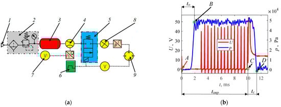 Schematic of the test stand: (a) 1—air supply; 2—air preparation system; 3—buffer tank; 4—mass flow meter; 5—tested injector; 6—injector control system; 7—voltage meter; 8—pressure sensor; and 9—oscilloscope. Examples of the waveforms of electric supply voltage and pressure at the outlet of the injector nozzle (b).