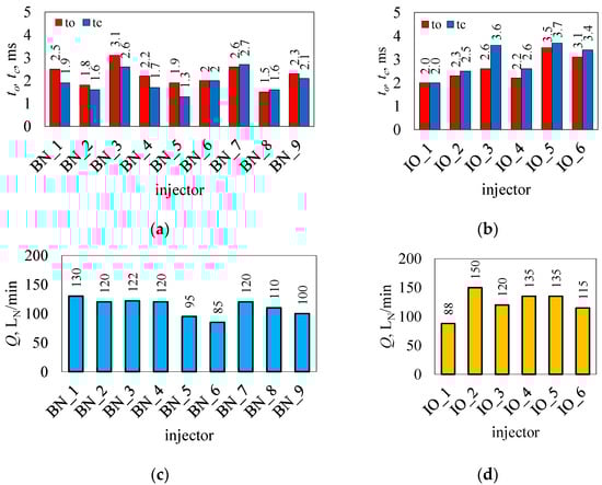 Of all the injectors tested (Figure 3a,b), as many as six showed an opening time to equal to or greater than 2.5 ms (BN_1, BN_3, BN_7, IO_3, IO_5, and IO_6). This is important in the context of the first test point, according to Table 2. This can result in a worst-case scenario of no opening or reduced flow. The average opening time to for brand new injectors was 2.2 ms, and that for injectors in operation was 2.6 ms. The closing times tc were 1.9 ms and 3.0 ms, respectively. The shortest opening time was shown by BN_8 (flap), it was 1.5 ms, while the longest time for IO_5 (piston) was 3.5 ms. The shortest closing time was recorded for BN_5 (plunger) at 1.3 ms, and the longest time for IO_5 (piston) was 3.7 ms. In the case of injectors labeled c-f (cross-flow), the indirect method test may be subject to error due to the collapse of the jet leaving the injector valve in the body. It was required for technical reasons that the opening and closing times be equal (to = tc), which was noted for injectors BN_6 and IO_1. In such cases, there was a relationship between the time of the control pulse timp and the response of the injector in the form Q. The worst in the relationship to/tc was the IO_3 injector, and it was 2.6 ms/3.6 ms.