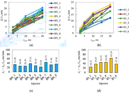 For the purpose of determining the areas of the resulting geometric figures using the Gaussian method, the tests were repeated five times at each of the measurement points specified in Table 2. Table A1 shows the average values of volumetric flow rate. Due to the scatter not exceeding 0.5 LN/min, the posting of deviations was abandoned. Despite an increase in the control pulse time at the shortest time tested from 2.0 ms to 2.5 ms at 2 × 105 Pa, three of the injectors tested did not show flow at this point. Of the brand new injectors, it was BN_9, while of the injectors in operation, they were IO_5 and IO_6. In these cases, the electromagnetic force generated by the coil was unable to lift the flow control element. This was due to the significant pressure difference below and above the actuator and the associated hydraulic drag force. In these three cases, additional tests were carried out to demonstrate the maximum in-line pressure at which the injector would begin to open. The pressure was gradually lowered and the flow meter readings were observed. Tests with an opening pulse duration of 2.5 ms showed that injector BN_9 opened at 1.2 × 105 Pa, while IO_5 opened at 1.1 × 105 Pa and IO_6 opened at 0.7 × 105 Pa.