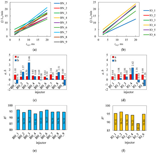The values of the coefficient of determination oscillated at 95.00 (Figure 5e,f). For brand new injectors, the average value R2 was 95.00. For injectors in operation, it was 94.00, with the IO_5 injector dominating this average result (89.21).