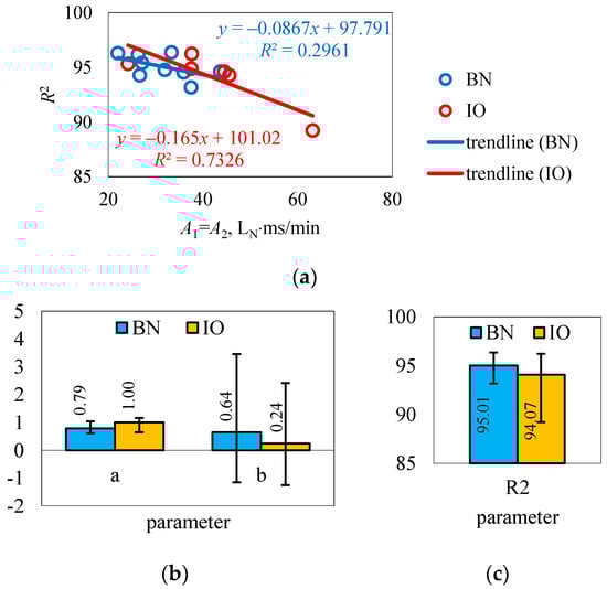 The variance values (Table 3) confirm the variation in each of the analyzed parameters (a, b, and R2), depending on the BN and IO groups. The table also includes values for the sum of squares of deviations SS, the number of degrees of freedom df, and the mean square error MS within groups (columns) and between groups (error).