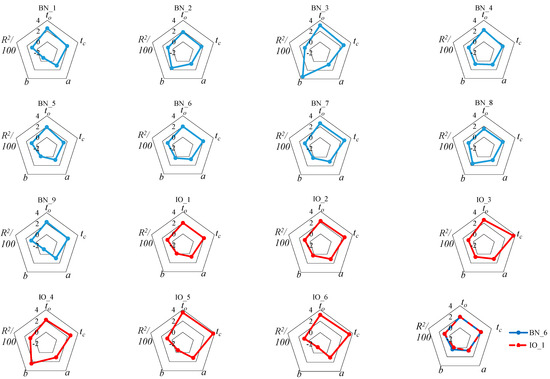 Due to the fact that there was some novelty in the analyses associated with the S-W method, there was a lack of data for comparisons with the results of this study. Therefore, it was decided to compile the results of this study into radar plots in order to further search for reasons for the differences between the values of the parameters of the rectilinear trend for the injectors studied. To achieve this, the coefficient of determination R2/100 was used, and the scale of the graph was set at (−2…4) (Figure 7). In the search for the relationship of the values of a, b, and R2 with the opening time to and closing time tc, a lack of correlation with respect to the parameter b in particular became apparent. Both the short opening and closing times of brand new BN_1 or BN_4 injectors gave different values of b. The variation in b was best shown by comparing BN_3 and BN_9. For injectors in operation, the opening to and closing tc times, except for IO_1, were longer than in brand new injectors. As before, this yielded different values of b. Parameters a and R2 did not have as much variation as b, but should be determined on a case-by-case basis for individual injectors. It does not directly follow from Figure 7 that the values of a and R2 depend on the design solution of the injector valve. Parameter b, on the other hand, reflects the geometric characteristics of the injector valve, and so it should be determined for comparisons on a case-by-case basis.