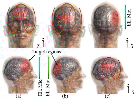 The position of the elliptical microstrips (Ell. Mic.) in (a) the frontal lobe, (b) occipital lobe, and (c) temporal lobe. The top row shows the x–z plane view, and the bottom row shows the y–z plane view. The target region for each elliptical microstrip is indicated with a red area.