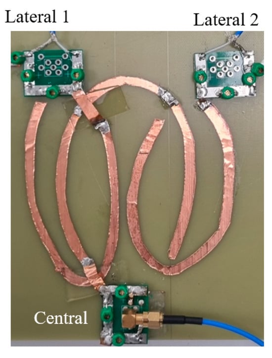 The proposed elliptical microstrips were also fabricated to verify their ability to resonate at 500 MHz. The microstrips were constructed on an FR-4 dielectric substrate using copper tape for the conductor lines, and matching circuits were incorporated to achieve a 50-ohm impedance. In this experiment, only the S-parameters were measured as imaging with the 11.74 T system is still under development. Figure 3 shows a photograph of the fabricated microstrip. The dimensions of the microstrip were 110 mm in length and 70 mm in width, with the copper tape having a width of 5 mm. Unlike the simulations, the FR-4 material was not cut into an elliptical shape, and the ground plane was implemented as a uniform copper sheet.