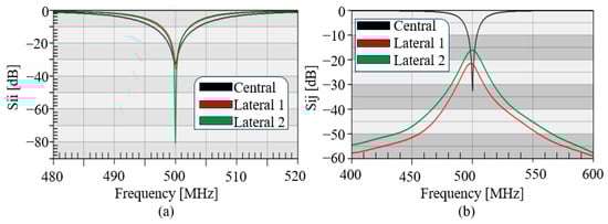 Tuning and matching with (a) Sii parameters for the three types of elliptical microstrips. (b) Sij parameters for decoupling of the central elliptical microstrip in relation to the lateral elliptical microstrips.