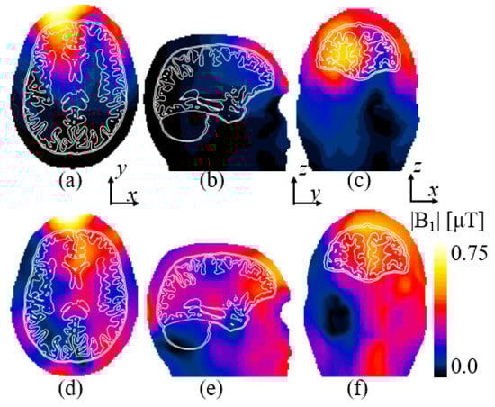 The computed |B1|-field in the frontal lobe for the reference coil in (a) axial, (b) sagittal, and (c) coronal views. The |B1|-field for the elliptical microstrips in (d) axial, (e) sagittal, and (f) coronal views.