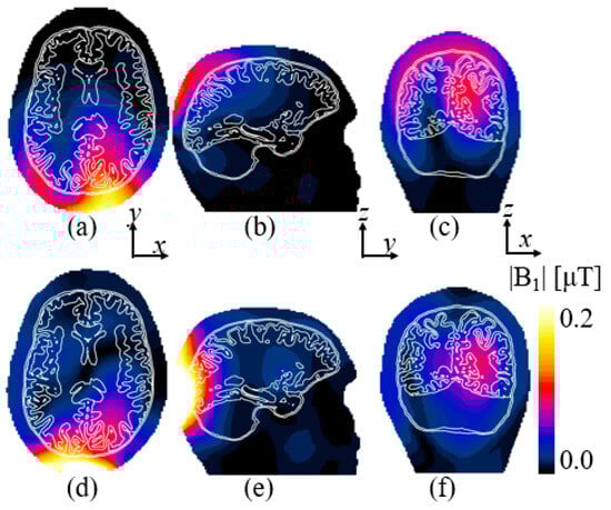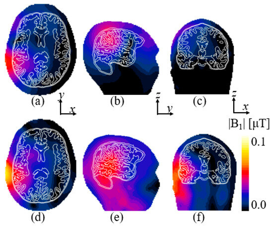 The computed magnetic |B1|-field for targeting the frontal lobe based on Figure 2a is displayed in Figure 5. The comparison maps show three types of views, namely axial (x–y axis), sagittal (z–y), and coronal (x–z). The magnetic |B1|-field produced by the reference loop coil is displayed in Figure 5a–c, and for the elliptical microstrips, the |B1|-field maps are shown in Figure 5d–f. It can be seen that the field map produced by the loop coil has a lower value in the right part of the frontal lobe, whereas the elliptical microstrip shows a more uniform field distribution. The advantage of the proposed method can be seen better in the case of the coronal view, where the area of the frontal lobe has a higher field intensity and uniformity compared to the reference coil. Uniformity of the |B1|-field expressed in the CV for each of the views in Figure 5 is summarized in Table 1. Overall, the proposed elliptical microstrip showed an improvement in uniformity of 22.8, 62.2, and 13.88% in the axial, sagittal, and coronal view maps, respectively, with respect to the reference loop coil. The peak SAR10g for the coil and the microstrip was 1.1 and 1.4 W/kg, respectively.