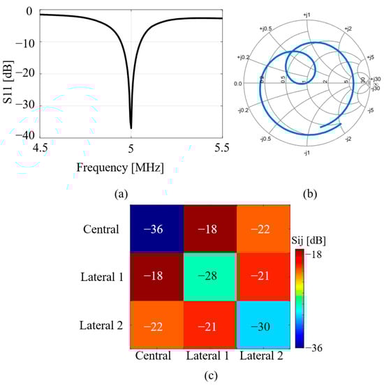 Measurements with the developed elliptical microstrips: (a) tuning, (b) matching, and (c) Sij parameters for decoupling of the central elliptical microstrip in relation to the lateral elliptical microstrips.