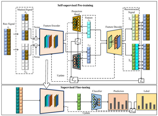 In the SSL-SEI problem, the training dataset consists of an unlabeled dataset and a small labeled dataset , i.e., . Here, denotes the number of unlabeled samples, denotes the number of labeled samples, and . During the pre-training stage, the feature encoder is trained through the self-supervised learning task to learn general feature representations of the signals. The optimization objective at this stage can be formulated as minimizing the following loss: