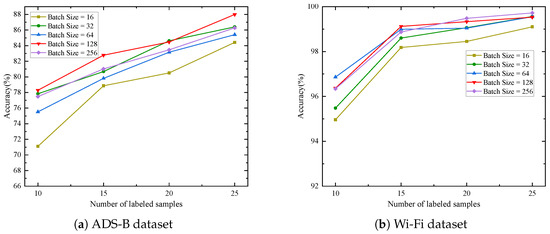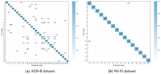 The model performance is evaluated using a real-world collected ADS-B dataset containing 30 emitters and an open-source Wi-Fi dataset [23] containing 16 emitters. The ADS-B dataset is constructed based on a receiver system comprising the AD9361 (Analog Devices, Norwood, MA, USA) RF front-end and the ZYNQ-7020 (Xilinx, San Jose, CA, USA) programmable logic platform, with the system’s center frequency set to 1090 MHz and a sampling rate of 40 MHz. The SNR of ADS-B signals is 12–15 dB. Each raw signal frame contains 4780 sampling points, which are segmented into samples using a sliding window with a length of and a step size of . During the pre-training stage, 100 signal frames per aircraft are selected and sliced to generate 500 training samples; in the testing stage, 80 signal frames per aircraft are sliced to produce 400 test samples. The Wi-Fi dataset consists of signals complying with the IEEE 802.11a standard [46] and has the SNR of 30 dB. It is collected using a USRP B210 (Ettus Research, Austin, TX, USA) device, with a center frequency of 2450 MHz. The signal sources are 16 USRP X310 (Ettus Research, Austin, TX, USA) devices. The signals are generated using a sliding window with a fixed window length of and a stride of . Each device contains 1000 signals in the pre-training stage and 800 signals per device in the testing stage. In the fine-tuning stage, experiments are conducted with 10, 15, 20, and 25 labeled signals per emitter.