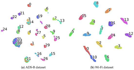 Table 4 and Table 5 present the F1-score and recall of the proposed CAML-SEI under different numbers of labeled samples. It can be observed that the F1-score and recall are generally consistent with the accuracy, which indicates that the model has relatively balanced prediction performance across all categories and shows certain robustness in terms of class balance. Figure 3 presents the confusion matrices of the proposed method on two datasets. The vast majority of the diagonal elements have very high values, intuitively confirming that most transmitters can be correctly identified. The t-SNE method is adopted to visualize the features learned by the model. As illustrated in Figure 4, the visualization results on two datasets demonstrate that the features of most categories form distinct clusters in the low-dimensional embedded space, exhibiting intra-class compactness and inter-class separation characteristics. This high degree of intra-class compactness and inter-class separation is a direct manifestation of the feature discriminability successfully achieved by the mechanism of the contrastive loss . Through its loss function design, effectively pulls together the different views of the same signal while pushing apart views from different signals. Although some classes in Figure 4a may overlap partially due to environmental factors such as noise and different flight states, the majority of classes still form clear clusters, which confirms the strong discriminability of CAML-SEI for global features.