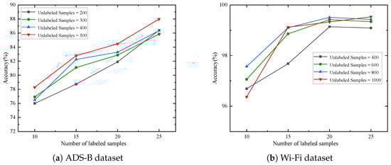To validate the effectiveness of the proposed asymmetric encoder–decoder architecture, its performance is compared against a symmetric architecture. Results based on the ADS-B and Wi-Fi datasets are presented in Table 14 and Table 15, clearly demonstrating the advantage of the asymmetric design. On the ADS-B dataset, the asymmetric architecture consistently outperforms the symmetric counterpart across all labeled sample scenarios, with a performance improvement of 6.25% to 8.96%. Similarly, on the Wi-Fi dataset, the asymmetric architecture maintains performance advantages, achieving a 3.57% advantage with 10 samples per class. While the performance difference diminished as the number of labeled samples increased to 25, the asymmetric design still achieved marginally higher accuracy. The asymmetric architecture effectively reduces model complexity and computational overhead by employing a powerful encoder to extract rich features while utilizing a simple decoder focused solely on reconstruction. This design mitigates overfitting of the complex decoder to the reconstruction task, facilitating the learning of more discriminative and generalizable feature representations by the encoders.
