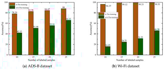 To validate the effectiveness of the proposed self-supervised pre-training method, we compared it with a baseline approach that does not use pre-training. In the baseline, both the feature encoder and classifier parameters are randomly initialized and then fine-tuned using 10, 15, 20, or 25 labeled samples. The experimental results shown in Figure 7 on both datasets demonstrate that the proposed self-supervised pre-training method consistently outperforms the baseline across various scenarios. Specifically, on the ADS-B dataset, with 10 labeled samples, the pre-trained model achieves an accuracy of 78.29%, which is 36.16% higher than the baseline without pre-training. On the Wi-Fi dataset, with 10 labeled samples, the pre-trained model achieves an accuracy of 96.37%, while the baseline without pre-training is only 16.05%. In scenarios with 15, 20, and 25 labeled samples, the proposed method continues to maintain robust performance. These results clearly indicate that the proposed method has significant advantages in scenarios with limited labeled samples. This validates its ability to maintain high performance with fewer labeled samples while effectively leveraging unlabeled data to maximize its potential.