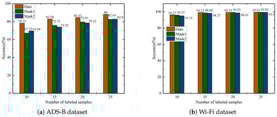 This experiment aims to validate the effectiveness of the proposed complementary masking mode. Two baseline methods are designed: Mask1, which applies random masking with identical masking ratios to both augmented signals, and Mask2, which employs random masking with masking ratios summing to 1 for the two augmented signals. The experimental results shown in Figure 8 demonstrate that the proposed complementary masking strategy achieves better performance under the condition of having very few labeled samples per class (e.g., 10 or 15). On the ADS-B dataset, when the number of labeled samples per class is 25, the proposed method achieves an accuracy of 88.00%, which is 5.36% and 5.2% higher than the other two methods, respectively. With only 10 labeled samples, the performance gap becomes more pronounced, where the proposed method achieves improvements of 11.07% and 8.71% over Mask1 and Mask2. On the Wi-Fi dataset, with only 10 labeled samples per class, the proposed method achieves 0.4% and 1.22% higher accuracy than Mask1 and Mask2, respectively. The experimental results indicate that the complementary masking mechanism enhances the robustness of feature learning, thus making it more adaptable to scenarios with scarce labeled data.
