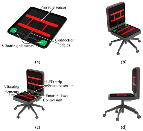 The smart pillow, which contains an integrated pressure sensor (red color) and vibrating elements (green color), is attached to the seating area of the chair. The control unit, which includes the PCB, two lithium-ion batteries, and a sound alarm, is mounted under the seating area. The LED strip is affixed to the outer side of the chair’s backrest. Since the LED strip is mounted externally, the user will not see it while seated. Its primary function is to inform the user whether the chair is occupied, whether it is safe to sit, and approximately how much time is left before they need to stand up, if required.