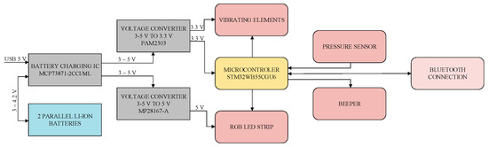 According to the microcontroller’s datasheet and the peripherals used, it was determined that the system requires a 3.3 V power circuit for the microcontroller and vibration elements and a 5 V power circuit for the LED strip. Other peripherals are powered and controlled by the microcontroller. Additionally, a battery charging integrated circuit (IC) is required to charge the lithium-ion batteries, control the charging current and voltage, protect the circuit from reverse battery polarity, stop charging at high temperatures, etc. Since the required input voltage is up to 5 V, two lithium-ion batteries are connected in parallel. This configuration increases the total battery capacity while maintaining the same voltage.