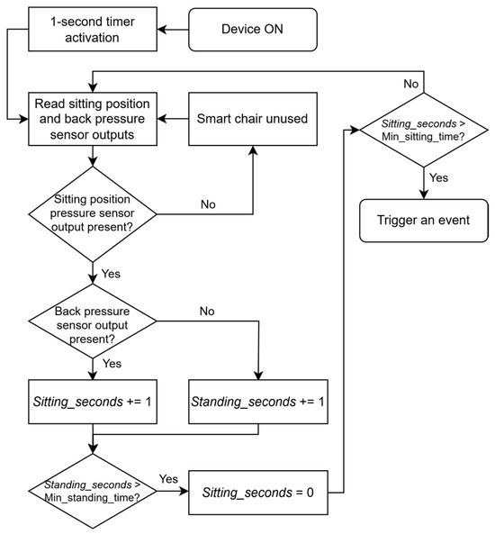 However, if sitting pressure is detected, the algorithm proceeds to check the back pressure sensor output. When back pressure is present, indicating proper seated posture with back support, the program increments a “Sitting_seconds” counter to track duration in this position. Alternatively, if no back pressure is detected despite seat occupation, the system increments a “Standing_seconds” counter and simultaneously resets the sitting counter to zero.