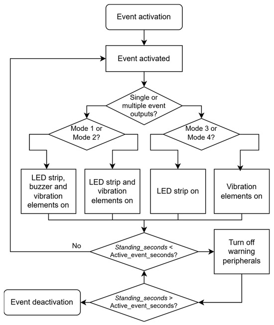 However, once the “Standing_seconds” counter exceeds the “Active_event_seconds” threshold, indicating sufficient time spent in a standing position, the algorithm initiates the deactivation process. This involves turning off all active warning peripherals and completing the event deactivation sequence.