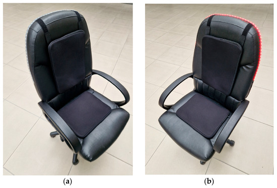 19], where the authors propose a seat cushion placed on a chair to monitor a person’s sitting behavior. However, in our development of a smart chair, we have also implemented backrest monitoring functionality to provide a more comprehensive assessment of proper sitting posture. Additionally, we introduced a smartphone application feature that allows users to track their sitting duration and posture correctness.