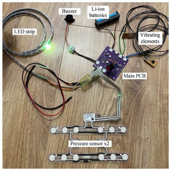 Figure 7. The LED strip provides visual feedback and notifications. The buzzer generates audible alerts or notifications. The Li-ion batteries serve as the primary power source for the system. The main PCB integrates the circuit design, including the microcontroller and power management components. The vibrating elements provide feedback for user interaction. The pressure sensor detects the user’s presence and monitors sitting activity.