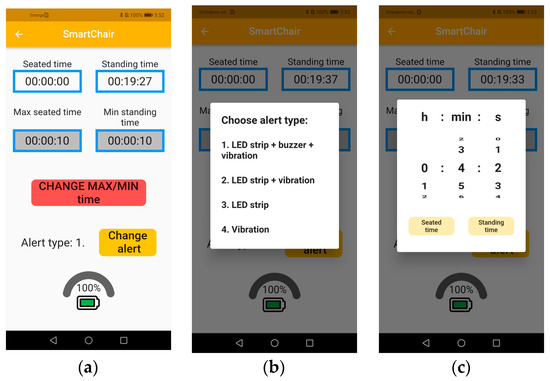 Figure 8c), enabling the user to modify the maximum seated time and minimum standing time. Pressing the yellow “Change alert” button opens another window (as shown in