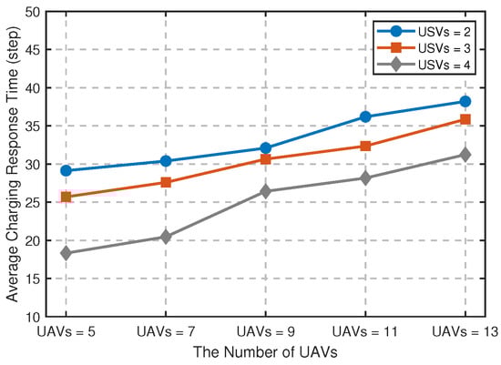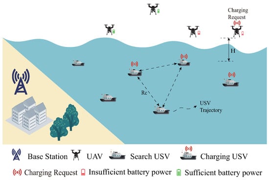 - Reward function: denotes the reward of USV i at time slot t given that the agent observes a system state and takes an action . The objective of the USVs is to learn the optimal strategy , which is to maximize the cumulative reward while interacting with the environment. Therefore, we design a reward function based on the local information of each agent as well as the collaborative information to incentivize the USVs to search the target and maintain the UAV battery level while minimizing the energy consumption due to the movement.Therefore, the reward function of USV i at time t is expressed aswhere represents the energy consumption of USV i for executing the corresponding task. represents a reward that the USV receives when it charges an UAV at time t. and are the penalty term for the USV failing to charge the UAV on time as well as for the collision, respectively.The energy consumed by each USV is determined by the distance it travels. Our objective is to devise an optimal path that minimizes energy consumption. Therefore, the reward for energy consumption is formulated asThe item is a reward component indicating the profit obtained by successfully charging an UAV at time slot t, which is defined as follows.where is the charging energy to the UAV at time t and k is a positive coefficient, representing a basic reward that encourages energy charging of the USV regardless of the charging outcome. represents the charging urgency of UAV . When a USV receives multiple charging requests from UAVs, its charging decision is prioritized based on the charging urgency of each UAV. By assessing the current battery level, the USV determines the charging urgency of UAVs and prioritizes charging service accordingly.The represents a penalty to an USV if it fails to charge any UAV in time and the remaining battery falls below the Eth. We define asIf there is a collision between USVs, there is a penalty, which we define aswhere represents the safe distance between USVs.