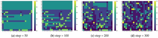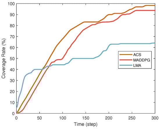 - Reward function : An appropriate reward function can help the UAVs explore better actions. The main objective of the exploration pursued by the UAV is to cover the unexplored area as soon as possible, minimize the energy consumption of the UAVs, and avoid collision with other UAVs. Therefore, the reward function is defined as follows.Target reward: This reward function encourages the UAV to find the target as soon as possible and mark the location of the target. We set that when , it means that the UAV has determined the target location, where is a threshold. The reward that the UAV can get when marking a target location is as follows.where is a positive constant.Coverage reward: This reward guides the UAVs to quickly cover the mission area, with fewer repetitive searches, and to cover as much unexplored area as possible. Therefore, the UAV search reward iswhere is the number of visits to the grid and is a penalty coefficient.Collision penalty: We use a penalty mechanism to guide UAV not to collide with other UAVs, and the collision penalty is [39]where is the safe distance between UAVs.In summary, the whole reward function is derived aswhere and are the reward correlation coefficients.