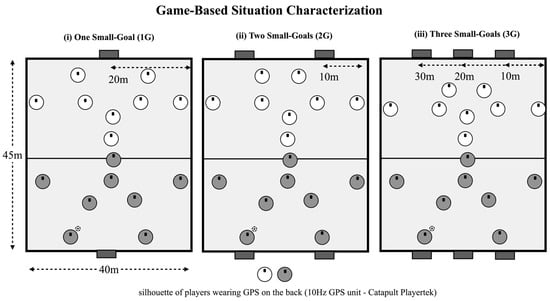 The present study utilizes a repeated measures design, where the players were randomly exposed to three experimental conditions (as shown in Figure 1, in which the number of goals was manipulated while keeping constant its size 1.2 × 1.0 m) []: (a) 8vs8 ball possession game played with one small goal (1G) positioned in the middle of the endline; (b) 8vs8 ball possession game played with two small goals (2G) placed wide on the pitch; (c) 8vs8 ball possession game played with three small goals (3G). During all conditions, goals were located equally distributed []. This game format was selected to involve a higher number of players, thereby promoting more complex tactical behavior. Additionally, having eight players allowed for the implementation of a representative team structure (i.e., defenders, midfielders, and strikers).