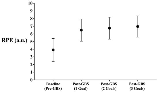 Mean values from the RPE reported by the players at the baseline and the different post-GBS conditions.