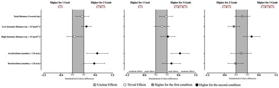 The differences between the effects of varying the number of goals in the players’ external load are reported in Table 1 and Figure 3. In general, all GBSs induced similar distances covered (F = 1.19, p = 0.312). In contrast, statistically significant effects were identified in the distance covered in low intensity (X2 = 4.86, p = 0.001), high intensity (F = 3.59, p =0.028), and in the number of accelerations (F = 10.0, p < 0.001) and decelerations (F = 6.55, p = 0.003). Accordingly, players covered a higher distance at the low intensity zone when playing with 2G than when playing with 1G (p = 0.024, ES = 0.29 [0.12; 0.46]) or 3G (p ≤ 0.05, ES = −0.27 [−0.48; −0.07]). In contrast, playing with 3G led towards higher distance covered at high intensity when compared to 2G (p ≤ 0.05, ES = 0.35 [0.06; 0.63]). Additionally, playing with 1G decreased the number of accelerations when compared to 2G (p = 0.003, ES = 0.67 [0.30; 1.04]) and 3G (p < 0.001, ES = 0.65 [0.34; 0.96]) and the number of decelerations when compared to 2G (p = 0.012, ES = 0.56 [0.19; 0.93]).
