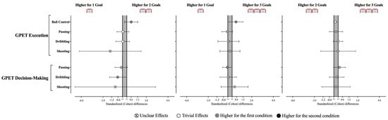The decision-making and execution (see Table 2 and Figure 4) for the passing, dribbling, shooting, and ball control variables revealed no statistically significant effects were identified between the GBS scenarios (Decision-Making: Passing, X2 = 1.20, p = 0.550; Dribbling, X2 = 2.24, p = 0.326; Shooting, X2 = 1.27, p = 0.529; Execution: Ball Control, X2 = 5.20, p = 0.074; Passing, X2 = 3.67, p = 0.159; Dribbling, X2 = 2.38, p = 0.305; Shooting, X2 = 3.45, p = 0.178) (Table 2 and Table 3). Despite this, the results derived from the effect size allow some inferences. Accordingly, playing with 1G seems to promote players’ dribbling decision-making when compared to 2G (ES = −0.64 [−1.39; 0.11]). In addition, players demonstrated better ball control execution when playing with 2G and 3G compared to 1G (vs. 2G, ES = 0.61 [0.0; 1.21]; vs. 3G, ES = 0.55 [−0.10; 1.21]).