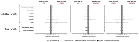 No statistically significant differences were found between the GBS modifications in terms of individual (see Table 3 and Figure 5; Time under possession, X2 = 0.96, p = 0.618; Ball control, X2 = 0.788, p = 0.674; Passing, X2 = 0.602, p = 0.740; Dribbling, X2 = 0.545, p = 0.761; Shooting, X2 = 0.667, p = 0.717; Goals, X2 = 4.00, p = 0.135) and team technical–tactical variables (Ball Possession Time, X2 = 0.958, p = 0.619; Players per possession, X2 = 0.712, p = 0.700). Despite this, the team tends to spend more time in possession during the 1G than in 3G (ES = −0.28 [−0.71; 0.16]), which may result from involving more players in 1G than in 3G (ES = −0.29 [−0.73; 0.15]).