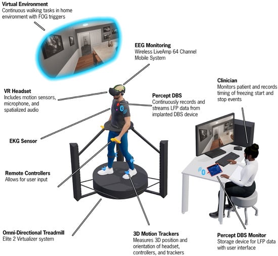 - Zhao, H.; Feng, Z.; Hao, S.; Tan, H.; Zhan, S.; Liu, W.; Lu, Y.; Cao, C. A Virtual Reality (VR) based Comprehensive Freezing of Gait (FOG) Neuro-electrophysiologic Evaluation System for People with Parkinson’s Disease (PD). In Proceedings of the 2023 45th Annual International Conference of the IEEE Engineering in Medicine & Biology Society (EMBC), Sydney, Australia, 24–27 July 2023; pp. 1–5. [Google Scholar] [CrossRef]