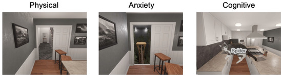 First-person views of the CC-VHE assessment modules that include the following: (1) The Physical module includes narrow doorways and changes in flooring patterns; (2) The Anxiety module requires the navigation of elevated, narrow walkways over a forest of trees; and (3) The Cognitive module requires walking while performing a simultaneous cognitive-motor task identifying congruent or incongruent stimuli. The example illustrated in this figure represents an incongruent stimulus: the word “Spider” is incongruent with the picture of a cat; the correct response from the participant would be to activate the hand controller in the left hand.